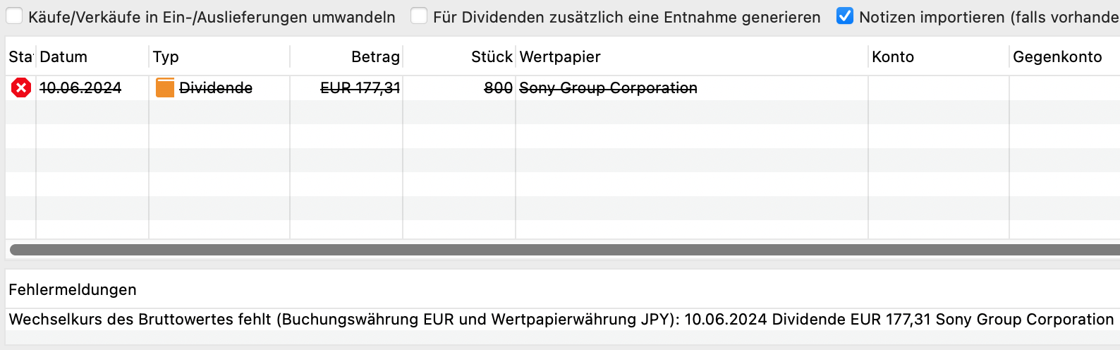Allerdings erwarte ich nicht, dass eine Änderung bankseitig bald umgesetzt wird. Die Dezember-Dividende war jedenfalls noch im gleichen Format ausgewiesen. Allerdings funktioniert der Import momentan noch gar nicht. Daher würde ich mich freuen, wenn die Import-Routine auf das derzeitige Format angepasst werden würde. Die User könnten den Wechselkurs - falls notwendig - ggfs. später korrigieren.