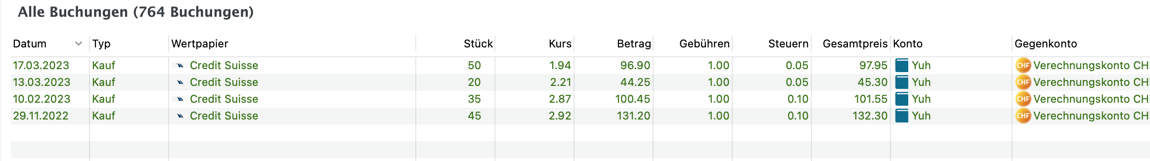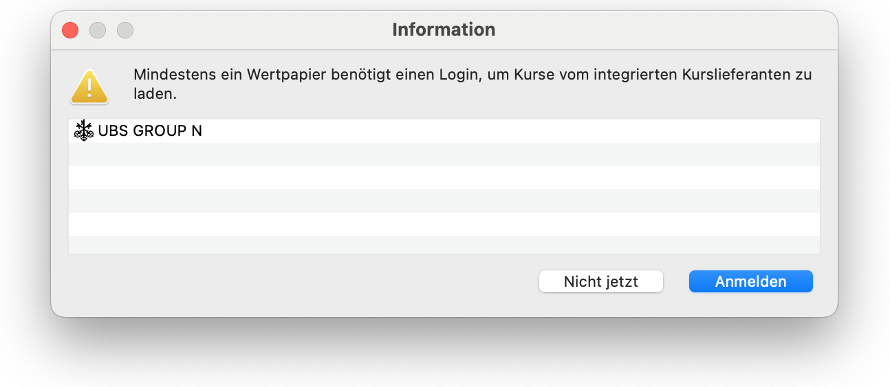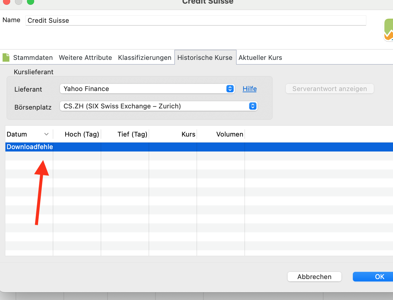 Das Symbol “CS.ZH” gibt es bei yahoo nicht. Musst Du eben ändern. Entweder das Symbol oder die Kursquelle. Oder den Namen und die ISIN. Du musst doch wissen was mit Credit Suisse passiert ist. Fusion der Credit Suisse mit UBS eintragen