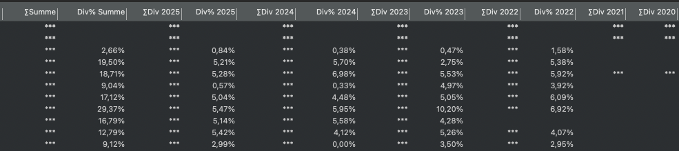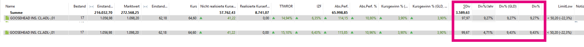 Dann habe ich das evtl falsch verstanden? Der YOC ist nicht Dividendenrendite pro Jahr bezogen auf den Einstandspreis, sondern “wieviel habe ich in % von meinem Einstandspreis bisher an Dividende erhalten”? Das wäre dann der ganz rechte Wert “Div%”?