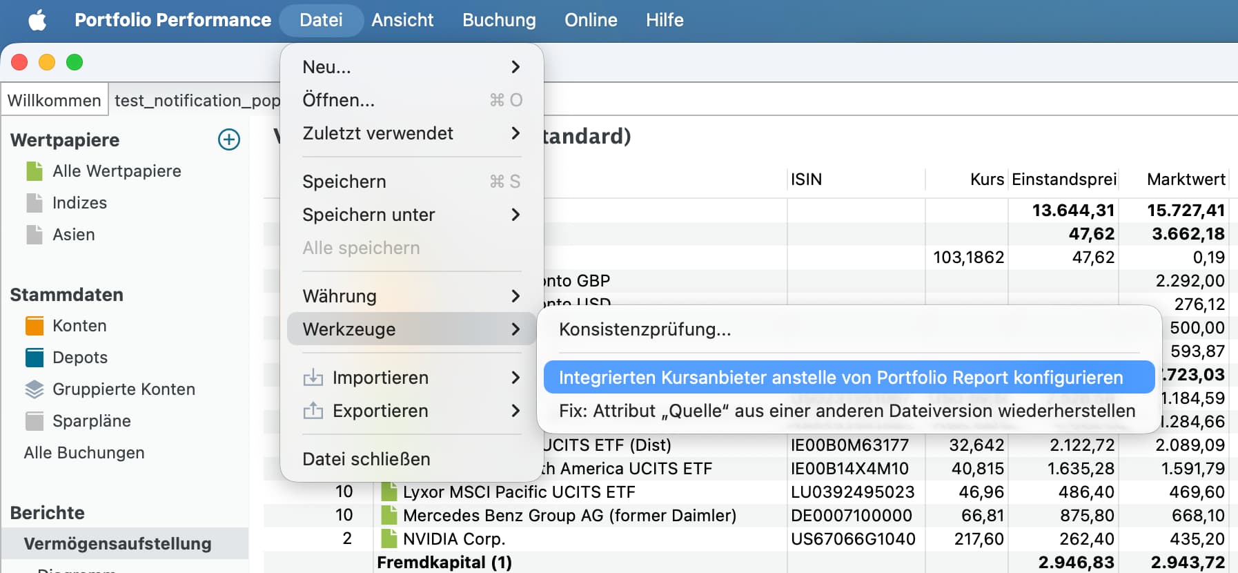 Kurz zu dem integrierten Kurslieferanten: Die Kurse werden anhand des Ticker Symbols geladen. Die Migration sucht aber zunächst anhand der ISIN und erst dann mit dem Ticker Symbol. Standardmässig wird XETRA ausgewählt. Du brauchst eine kostenlose “Portfolio Performance ID” da ich Kurse nur an registrierte “Mitglieder” weitergeben darf.