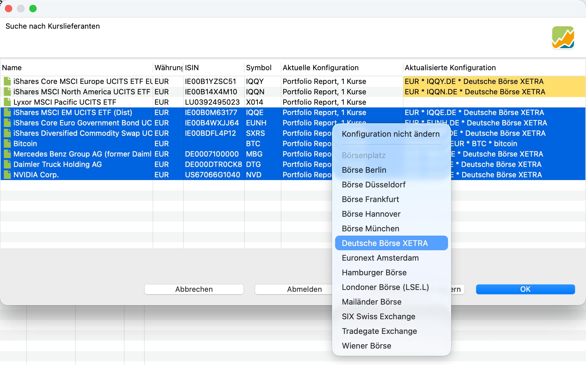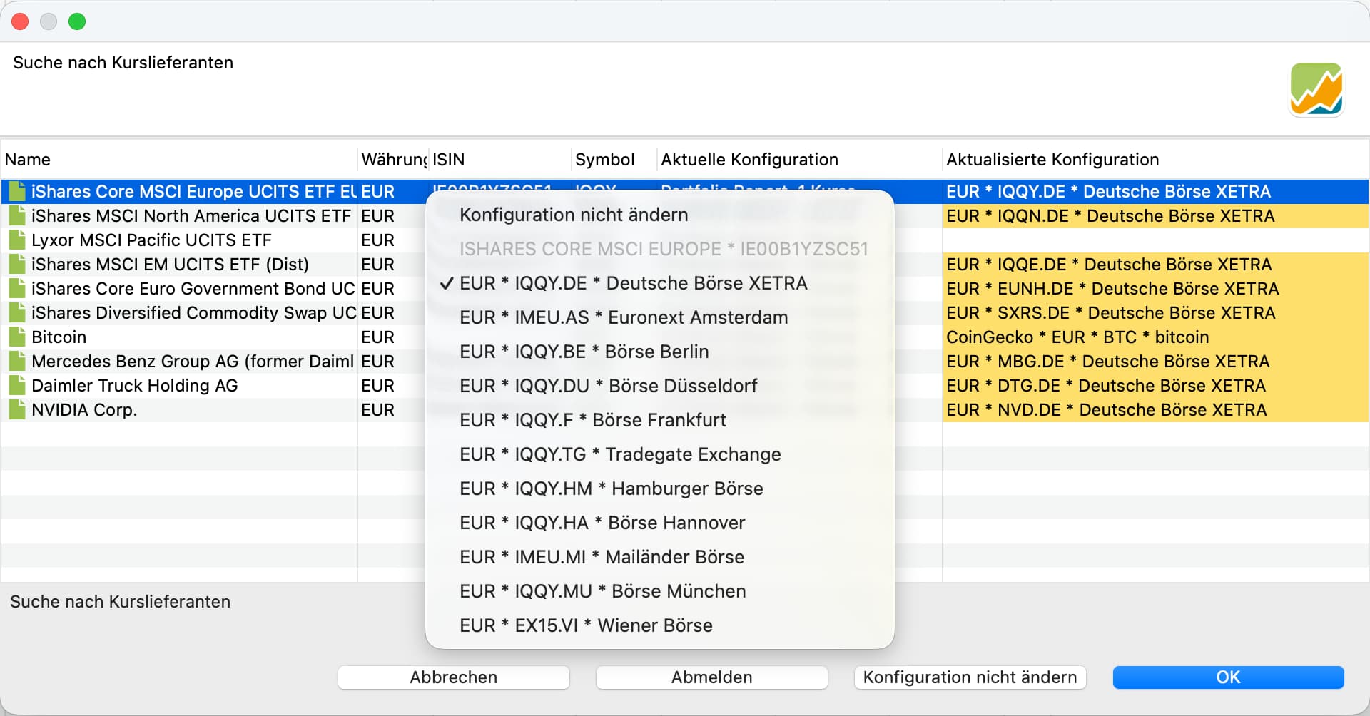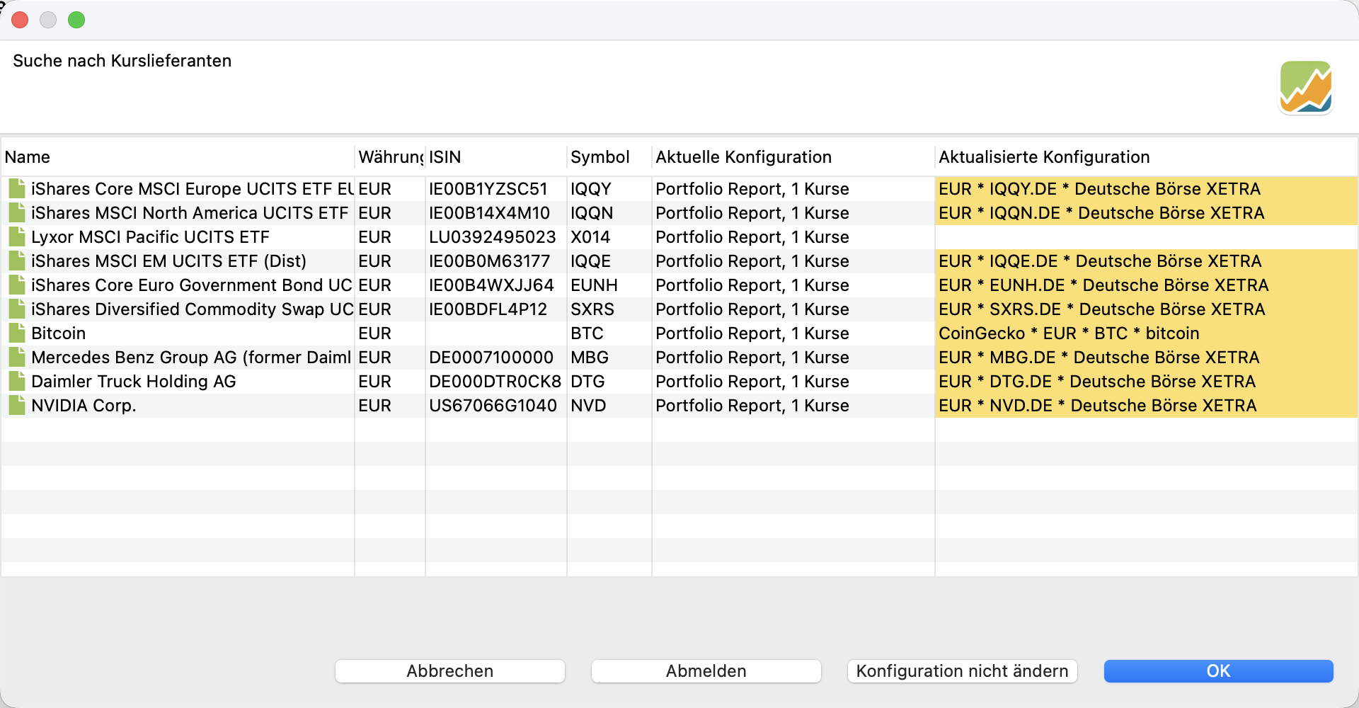Es öffnet sich ein Dialog, in dem die Wertpapiere angezeigt werden, die aktuell auf Portfolio Report konfiguriert sind. Die Suche schlägt dann den integrierten Kurslieferanten vor (oder CoinGecko für Kryptos).