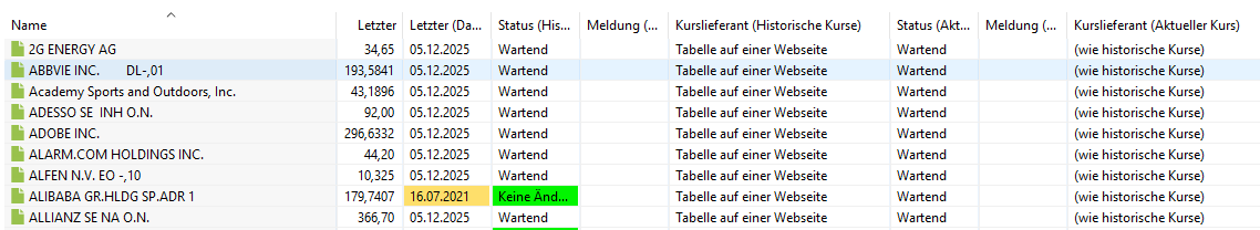 “Wartend” heißt hier es wird gerade für ein anderes Wertpapiere versucht Kurse zu laden. Wenn Du “Tabelle auf einer Webseite” auswählst, dann wird immer nur ein Request pro Webseite geschickt (ansonsten antworten die meisten Seiten nicht mehr).