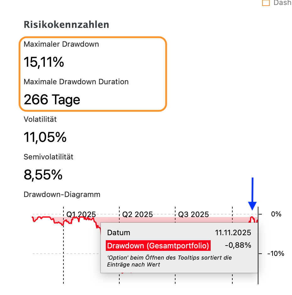 To take a German screenshot (apology), there are widgets for max drawdown and duration (orange) but you also want a widget for the current drawdown (the value of the blue arrow).