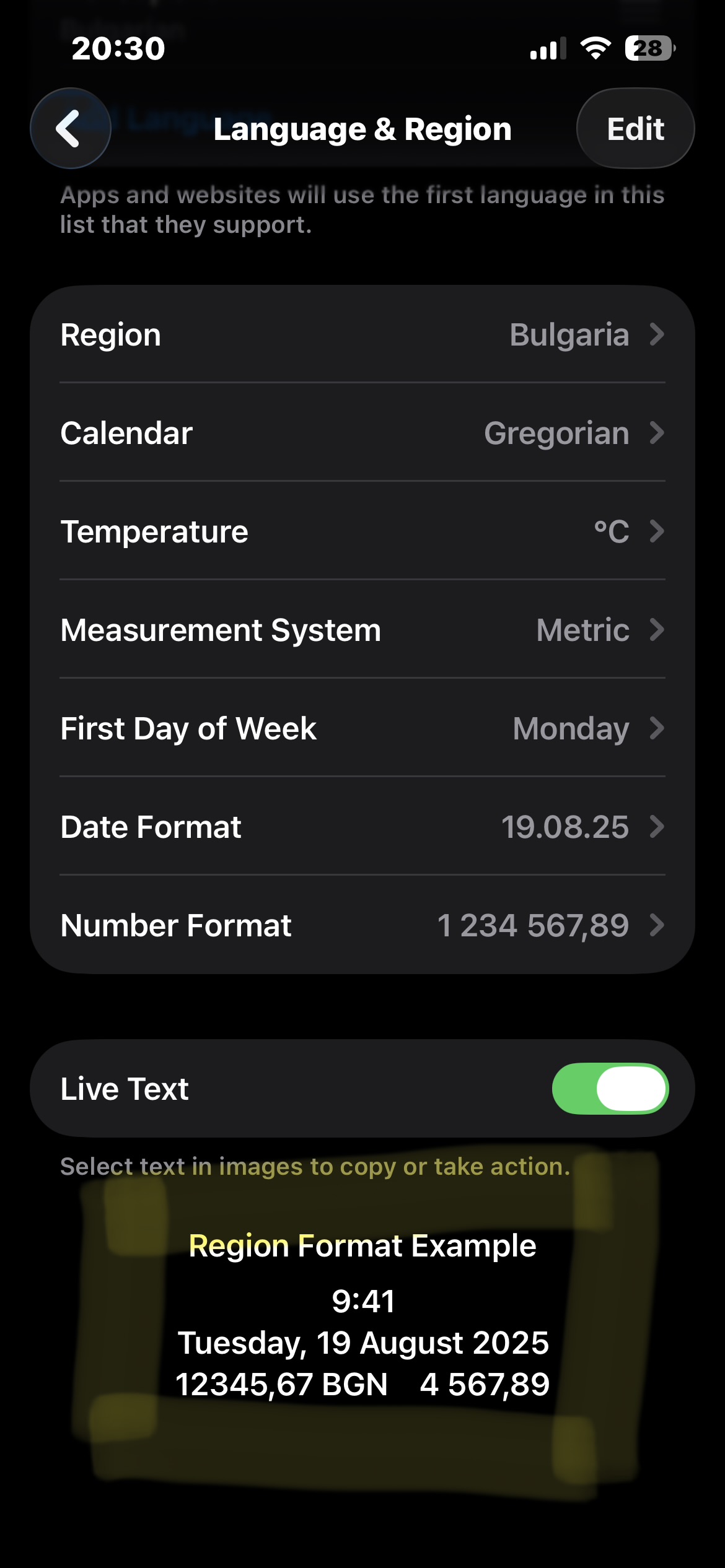 The selected Region is Bulgaria. The first language is English(UK) I double checked its UK and not US.