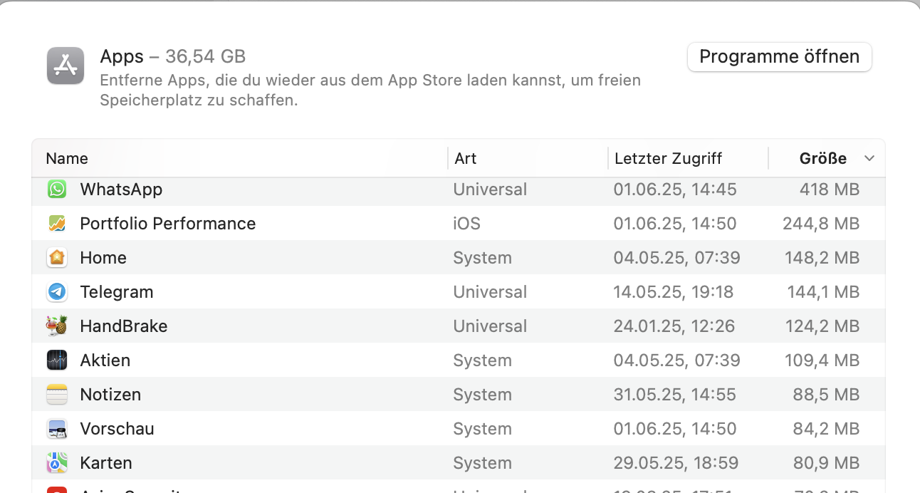 Screenshot 3 - Belegung innerhalb der Apps mit 244 MB, kommt mit den Rundungsfehlern etwa auf die richtige Gesamtsumme - einzig merkwürdiger Fact ist hier, das in der ganzen Programmliste PP als einziges Programm in der Spalte Art mit iOS angezeigt wird)?!?!?!