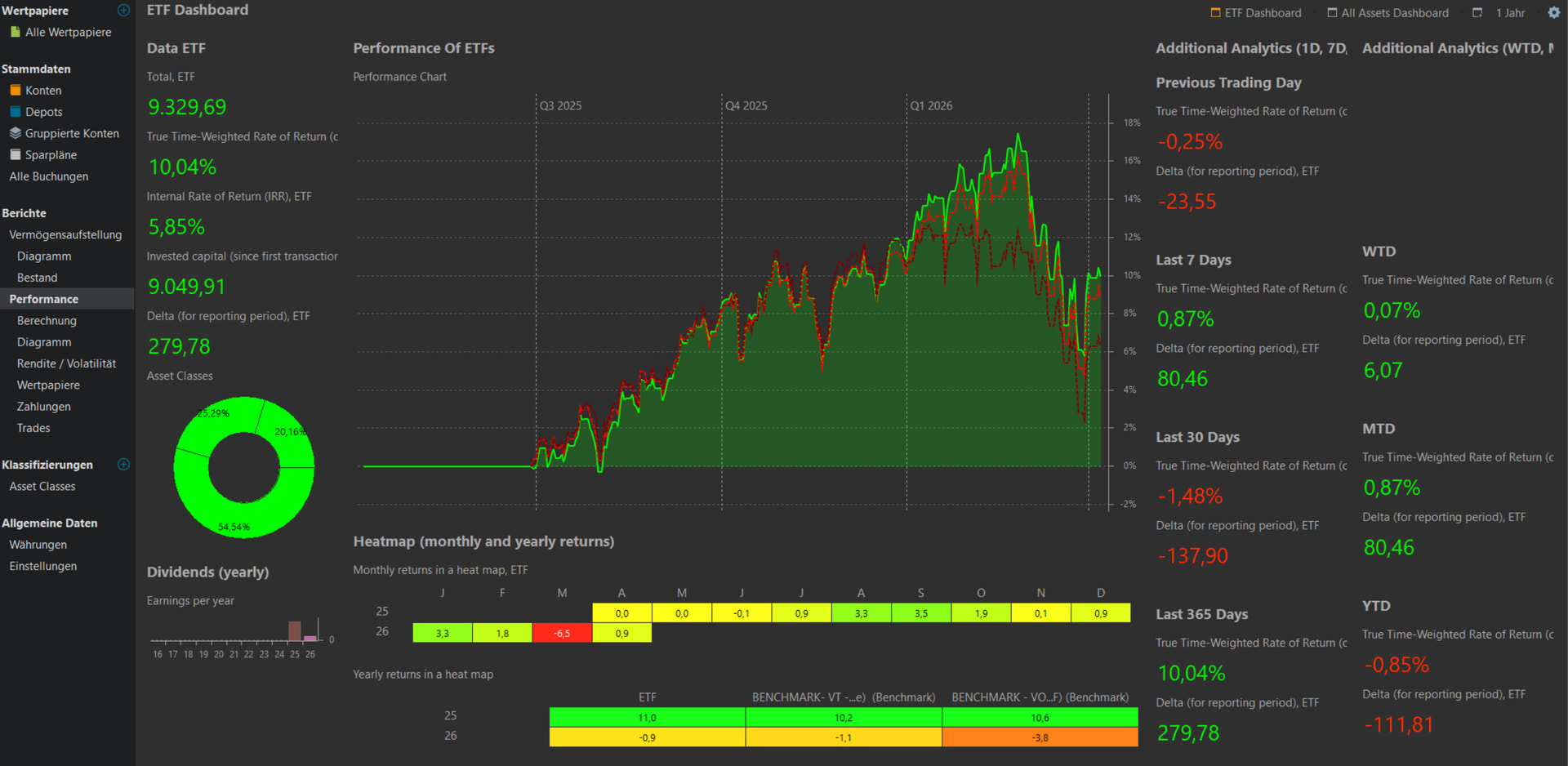 Soweit klappt es gut und ich habe mir auch ein paar Performance Dashboards zusammengebaut. (nur ETF, alle Vermögenswerte, Crypto etc.)