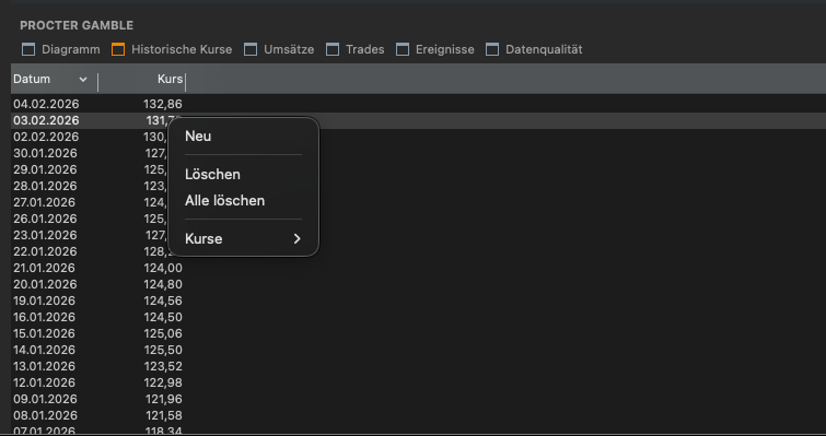 Ich vermute du guckst im Wertpapiere editieren Dialog, du musst aber einfach unter alle Wertpapiere unten in der Panel (ggf. mit Cmd+L (falls der shortcut genauso wie bei windows ist) einblenden.