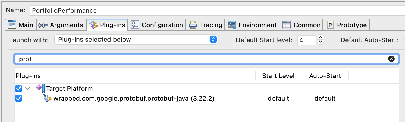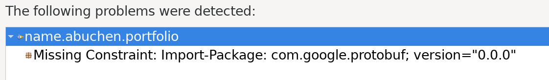 Das ist interessant. Obwohl das protobuf bundle vorhanden ist, meckert Eclipse über die fehlende Abhängigkeit? Schau doch mal was “Validate Plug-in Dependencies” im dem Edit Dialog der Launch Configuration als weitere Abhängigkeiten angibt - und füge nur die von protobuf hinzu (beim mir liefert der Dialog bei der generierten Launch Configuration übrigens keinen Fehler).