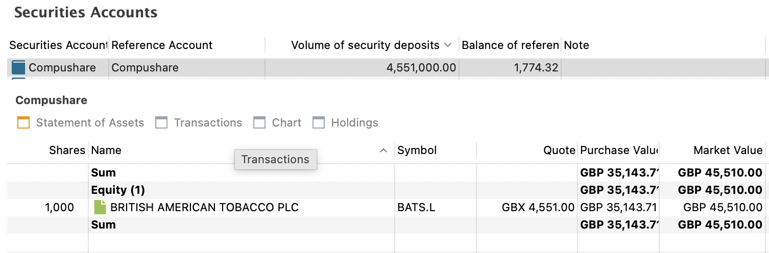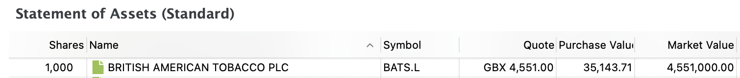 I’ve added transactions for BATS.L, the feed is in GBX, and I’ve entered the transactions ensuring the right prices are used. PP automatically converts GBX to GBP when I post the transaction, and the reference (cash) account is GBP. Everything seems fine, the purchase and market values are fine but the Volume of security takes the number of shares and multiplies by the GBX value, giving a volume x 100, which distorts calculations on the statement of assets. I cannot find how to fix this. I have reviewed previous posts on similar issues but their solution was to change the feed from GBX to GBP, which I cannot do.