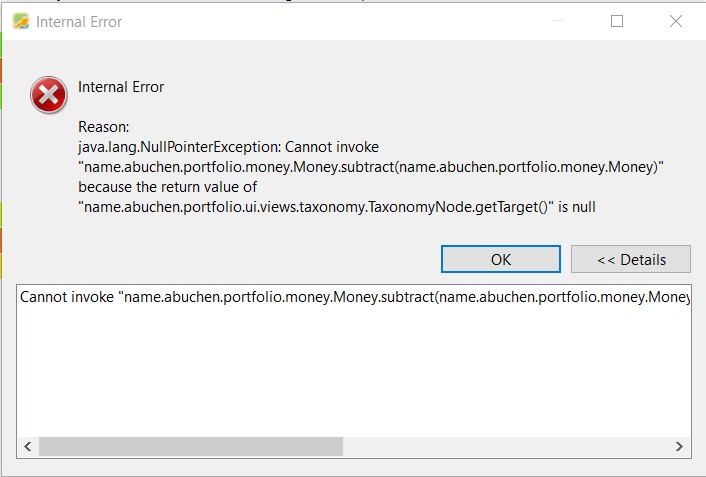 I would help me if you can create a copy of your file, delete all transactions, and send it to portfolio dot performance dot help at gmail dot com. And check if the error still occurs in this reduced example, it would help. Otherwise, maybe you can paste a screenshot of the taxonomy you use to display in the widget.