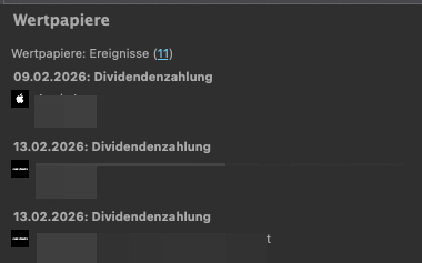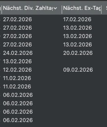 kann es sein, dass im Widget “Wertpapiere: Ereignisse” zukünftige Dividendenzahlungen ausschliesslich die Ex-Tage ausgewertet werden? Zumindest bekomme ich es nicht hin, dass ich alle bzw. nur die Zahltage angezeigt bekomme.